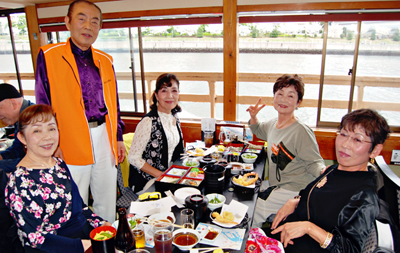 浅草駅前の吾妻橋から「船宿あみ清」の屋形船に乗り込んだ一行。船は隅田川をお台場まで南下。川沿いの満開の桜並木と、食べ放題の天ぷらや新鮮な刺身など料理を堪能した。