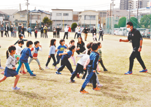 3月12日(日)、平野運動場で小学生以下対象の「足が速くなる! かけっこ教室」が行われ、約100名の子どもたちが走り方のコツをプロから教わった。