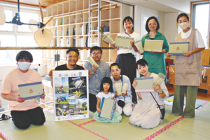 写真上/完成したミニ畳と記念写真。左端は岡田湯店主・岡田博樹さん、その隣が小川さん=岡田湯で