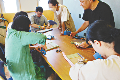 今回は初の「ミニ畳作りワークショップ」も岡田湯(関原3-43-2)で開催。参加者たちは小川さんに教えてもらいながら、畳床ボードにホチキスのような器具を使って畳表を取り付け、好きな柄の畳縁でマイ畳を仕上げた。