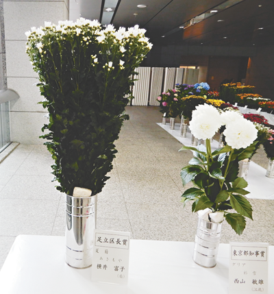 都知事賞を獲得した西山さんのダリアは、欠点が目立ちやすい白色の花色ながら鮮やかさがあり、花や茎、葉の形が優れていた点が評価された。また、区長賞の横井さんの夏菊は、ボリュームがあって草丈も揃い高い市場性を備えている点が好評価につながった。その他、1等賞7点、2等賞8点、3等賞10点が選ばれた。