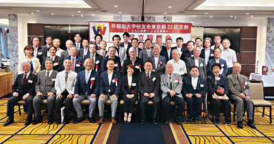 総会議長選出により、青野会長が選任され議事進行。第1号議案・2022年度活動報告を谷古宇文宏幹事長、会計報告を内田眞会計幹事、会計監査報告を佐藤浩一会計担当監事が行った。第2号議案・会長改選では、青野会長が再選。来年度より4年間、足立稲門会が所属する第1ブロックが、23区全体の運営を行う支部長区を務めるため、足立稲門会の役割は大きい。第3号議案・2023年度活動計画案を谷古宇幹事長、同予算案を内田幹事が行い、総会は無事に終了した。第2部では、健康テレビ番組でもお馴染みの早稲田大学保健センター医師・そしがや大蔵クリニック院長の中山久德氏(稲門医師会副会長/写真前列左から4人目)が登壇。「人生100年時代に向けての健康処方箋」を演題に、骨粗しょう症・脳梗塞などをキーワードに講演した。椅子から腰を浮かすスクワット、脳梗塞の早期発見方法など様々な知識が伝授され、一同熱心に聴き入った。