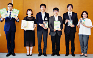 7月12日(水)には、小早川社長や絵本作家のはしももかさんらが区役所を訪れ、大山日出夫教育長と楠山慶之あだち未来支援室長に直接本を手渡した。