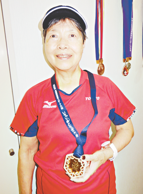 写真上/金メダルをかけた原則子さん