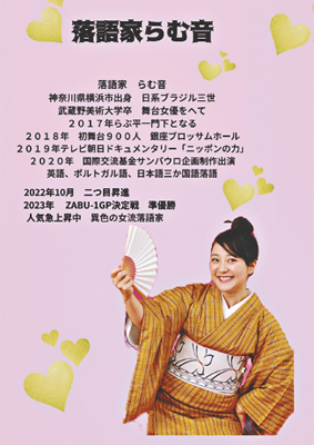 出演する落語家は、日系ブラジル三世で、3カ国語の落語を演じる異色の二つ目女流落語家・らむ音さん。