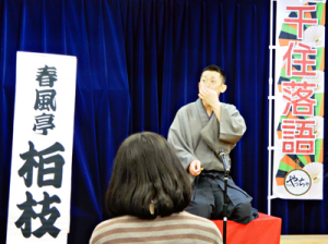 写真/熱演の春風亭柏枝さん=旭町自治会センターで