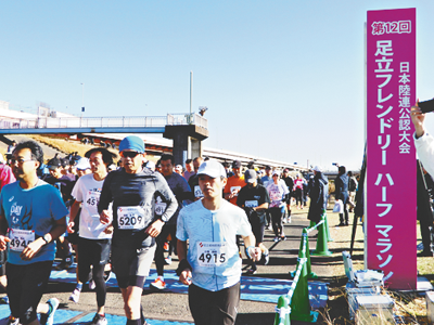 第12回足立フレンドリーマラソン(同実行委員会主催)が、12月17日(日)に荒川河川敷で開催され、ハーフ約21㎞と10㎞の種目に全国から3152人が出場。毎回ゲストで走っている足立区出身のマラソンランナー浅井えり子さんが今回も10㎞を走った。足立区内外の一般ランナー、小中学生を対象とした足立区民ロードレース大会(区主催)も開催された。367人が参加。