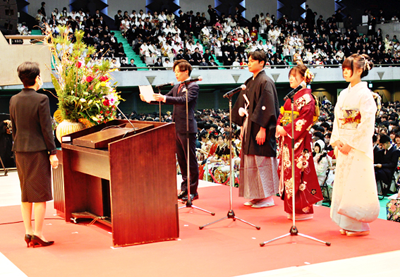 第2部のアトラクションで最初に登場したのは、津軽三味線とボート競技の二刀流で活躍中の沢目真直さん(早稲田大学2年)。自身も二十歳として迎えた晴れの場で見事な演奏を披露し、盛大な拍手に会場が沸いた。