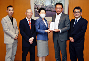 4月19日(金)には足立区役所に、同クラブの小林保彦会長(三祐医科工業㈱)、鈴木国博副会長(ザオー工業㈱)、野村祐一副会長(野村畳店)、鈴木茂仁氏(㈱トータルプランニングスズキ)が訪れ、近藤やよい区長に直接義援金を手渡した。