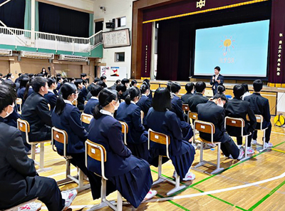 講演内容は「卒業後の人生で抱える可能性のある法律問題と解決策・相談窓口」で、クイズ形式の参加型で行われたため、3年生247人は興味をもって臨んだ。まず「高校生編」として「クリック詐欺」を例に「契約の基本」、さらに暴力ではない「児童虐待」について知識を得た。「大学・専門学校編」では「借金・性犯罪」、「社会人編」では「労働・離婚」なども学び、真剣に討議。最後に「法テラス」についての紹介に熱心に耳を傾けた。