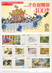 千住宿開宿400年の記念切手シートが、9月12日から足立区・葛飾区の全郵便局と東京中央郵便局(東京駅丸の内南口前「KITTE」内)で販売されている。日本郵便㈱東京支社が、足立区と包括連携協定を結んでいることから実現した。