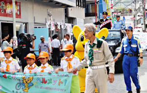 下/交通少年団の子どもたちとともに、学園通り商店街をパレード
