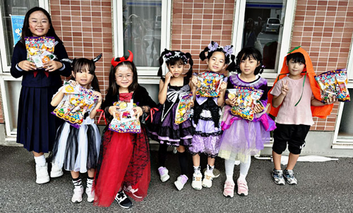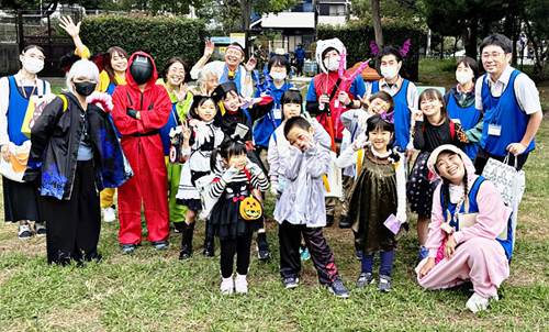 午後の保木間地区では、仮装した子ども10人を含む約20人が元渕江公園に集合。クリーン作戦を行ないながら、介護施設・ふちえ明生苑でお年寄りを慰問した後、花畑西小近くの介護施設・花畑あすか苑まで約2㎞を歩いた。両コースともに解散場所では、子どもたちが、ご褒美のお菓子、スタッフ手作りのキーホルダー、草花のタネなどを受け取ってニッコリ。