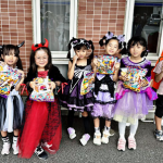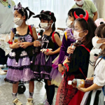 午前の花畑地区では、可愛く仮装した子ども7人に同伴の父母、スタッフらが加わった約20人が花畑5丁目の店舗「レコードブック花畑」から、燃える、燃えない、資源ゴミ別の箱を背負って出発。途中、介護施設・足立新生苑に立ち寄り、お年寄りたちと交流。その後、日介ケアセンター花畑までの約2㎞を歩いた。