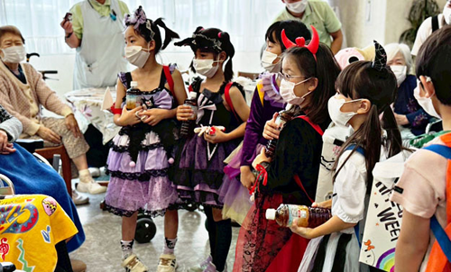 午後の保木間地区では、仮装した子ども10人を含む約20人が元渕江公園に集合。クリーン作戦を行ないながら、介護施設・ふちえ明生苑でお年寄りを慰問した後、花畑西小近くの介護施設・花畑あすか苑まで約2㎞を歩いた。