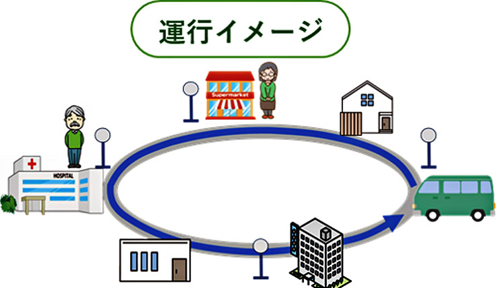使用車はワンボックスカーで、地域内21カ所(下りは20カ所)の停留所を回る。1乗車100円(現金払いのみ※未就学児は無料)。実施当初は2台で週3日(月・水・金)の午前8時~午後5時まで1日9便運行する(2月からは車両1台で週4日運行予定)。