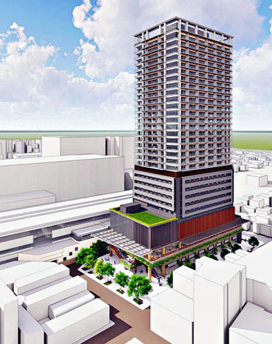 再開発事業は、施行区域面積約0・6ha、敷地面積約4800㎡、建築面積約3000㎡、延べ面積約4万4900㎡。地下1階、地上29階、高さ約123mで、1~4階は商業・子育て支援施設、5~9階はホテル、10~29階は住宅(住戸数は250~300)、地下に駐車場。北千住駅3階と直結するデッキを設け、水害時には垂直避難場所となる。