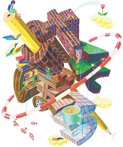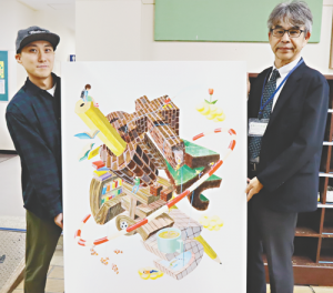 文字と絵を合体させた立体感のある独特のイラストを描く足立区出身のイラストレーター・勝倉大和さん(39)が、母校の創立30周年を記念して西保木間小学校(佐分利規雄校長)に絵を寄贈した。