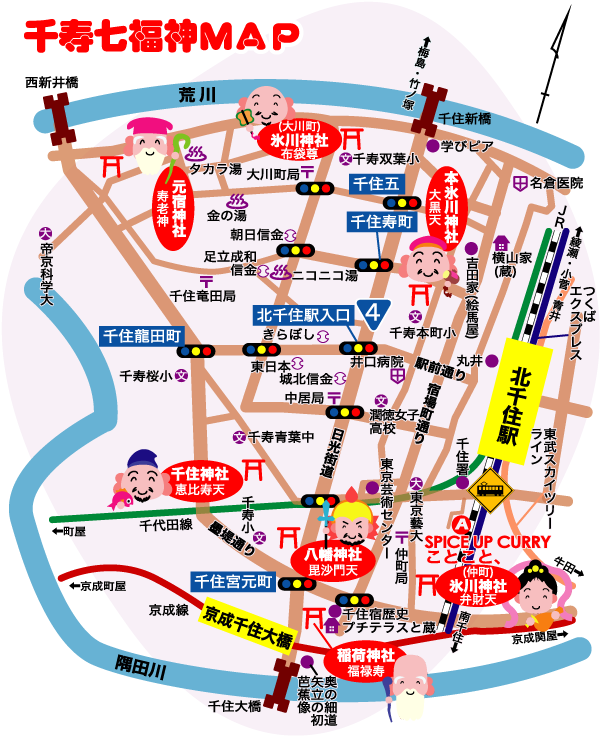 「千住宿 千寿七福神めぐり」は、地図のように北千住駅西口を降りてから時計回り(右回り)でも反時計回り(左回り)でもOK。時計回りで行くと、弁財天(芸術・学業)の氷川神社(千住仲町)、福禄寿(幸福・財産・健康)の稲荷神社(千住河原町)と来て国道4号線を渡り、毘沙門天(勝運)の八幡神社(千住宮元町)、恵比寿天(商売繁盛)の千住神社(千住宮元町)から少し離れた寿老神(長寿)の元宿神社(千住元町)、布袋尊(子宝・良縁)の氷川神社(千住大川町)と歩き、大黒天(五穀豊穣)の千住本氷川神社(千住3丁目)でゴール。約6㎞、お参りの時間も入れてゆっくり歩き、約3時間のコース。