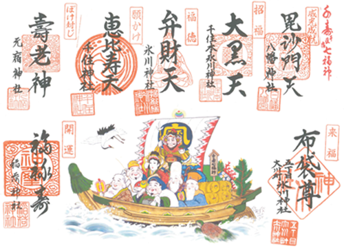参拝は元旦~7日(水)午前9時~午後4時。各神社で色紙宝船(2000円)を求め、御朱印(各300円)を納める。無料の子ども用スタンプラリーもあり。ほかに、七福神のご神体(1体700円、7体でお敷き代込み5000円)も人気。
