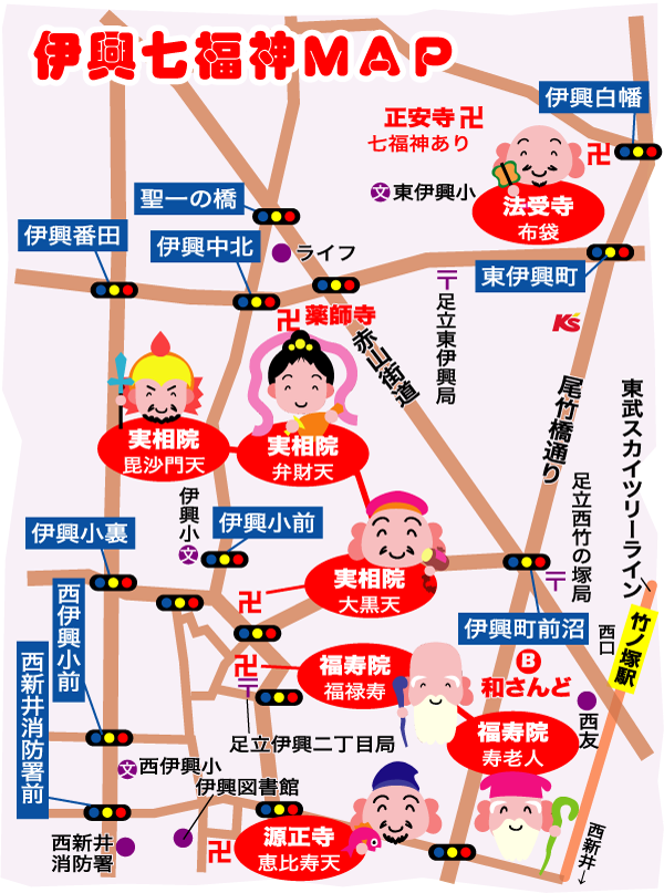 竹ノ塚駅西口の伊興地区の4寺にも七福神があり、毎年七福神めぐりをする人が多い。実相院には毘沙門天・弁財天・大黒天が、福寿院には福禄寿・寿老人が、源正寺には恵比寿天が、法受寺には布袋尊がそれぞれ安置されている。参拝期間は、元旦~7日(水)午前9時~午後4時。4寺のいずれかで500円の色紙を買い、スタンプ1個100円。ご朱印は300円。