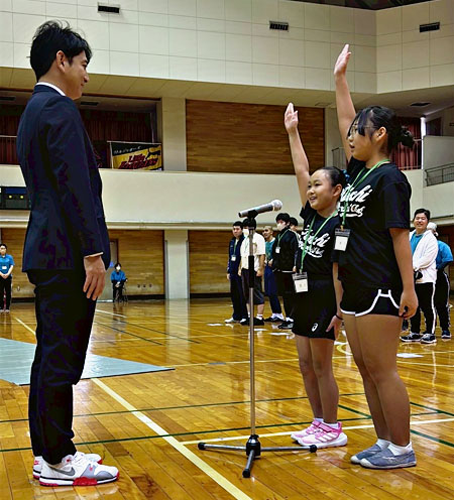 新島なずなさんと尾股玲菜さん=スポーツセンターで
