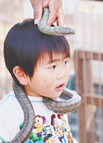 特に前回いなかったヘビが子どもたちに大人気。係の人にヘビを首に巻いてもらうと、最初は恐る恐るだったが、次第に慣れてくると優しく撫でてあげるなど楽しく触れ合っていた。