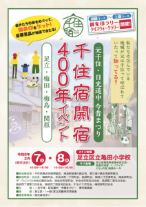千住宿が開宿して400年を記念したイベントが千住地域を中心に行われてきたが、荒川の反対側にある元は千住と呼ばれていた地域があった。現在の足立と梅島の一部だ。そこの地域の商店街と町会・自治会の人たちが中心となって周辺地域一帯で「~元千住・日光道中 今昔まつり~(足立・梅田・梅島・関原)」を2月7日(土)~8日(日)に亀田小学校や梅田亀田公園など周辺地域で様々な企画を行う。