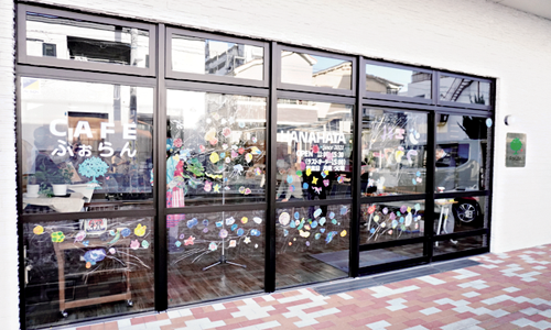 大きなガラスの扉を色とりどりのシールが彩り、店内は明るい花が咲いたよう――。あいのわ福祉会が運営する生活介護事業所・花畑あかしあ園(花畑3-16-4)の1階にある、カフェ「ふぉらんHANAHATA」で1月、ジェルフラワーを作るワークショップとお披露目会が開かれた。