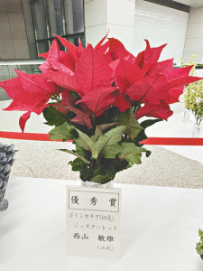 西山さんのポインセチアは「ジェスターレッド」という品種で、水あげが良好で十分な草丈と品種特有の着色苞葉(苞と呼ばれる花の基部につく葉が変形した器官が花びらのように鮮やかに色づいたもの)を有し、実用性の高い出品だった点が評価された。
