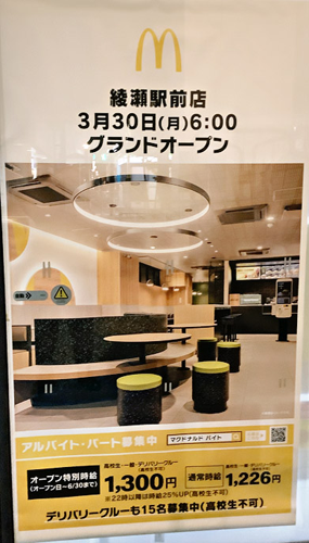 昨年末に綾瀬駅東口前に竣工した32階建ての住友不動産のマンション1階に、3月30日(月)マクドナルドがオープンする。2017年4月に同地で閉店して以来