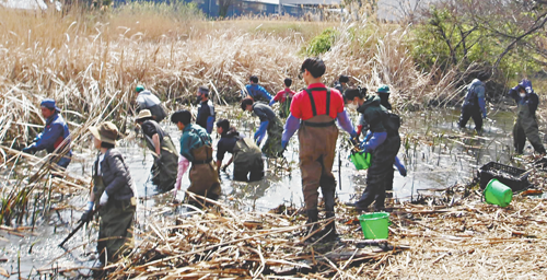 を履いて、頼もしいパワーで葦の根っこ堀りをし、狭くなってしまっていた池や水路を広げた。